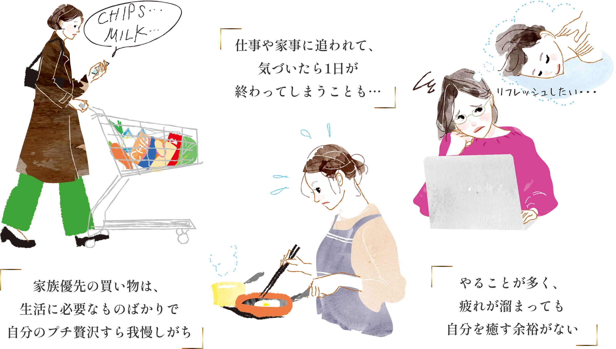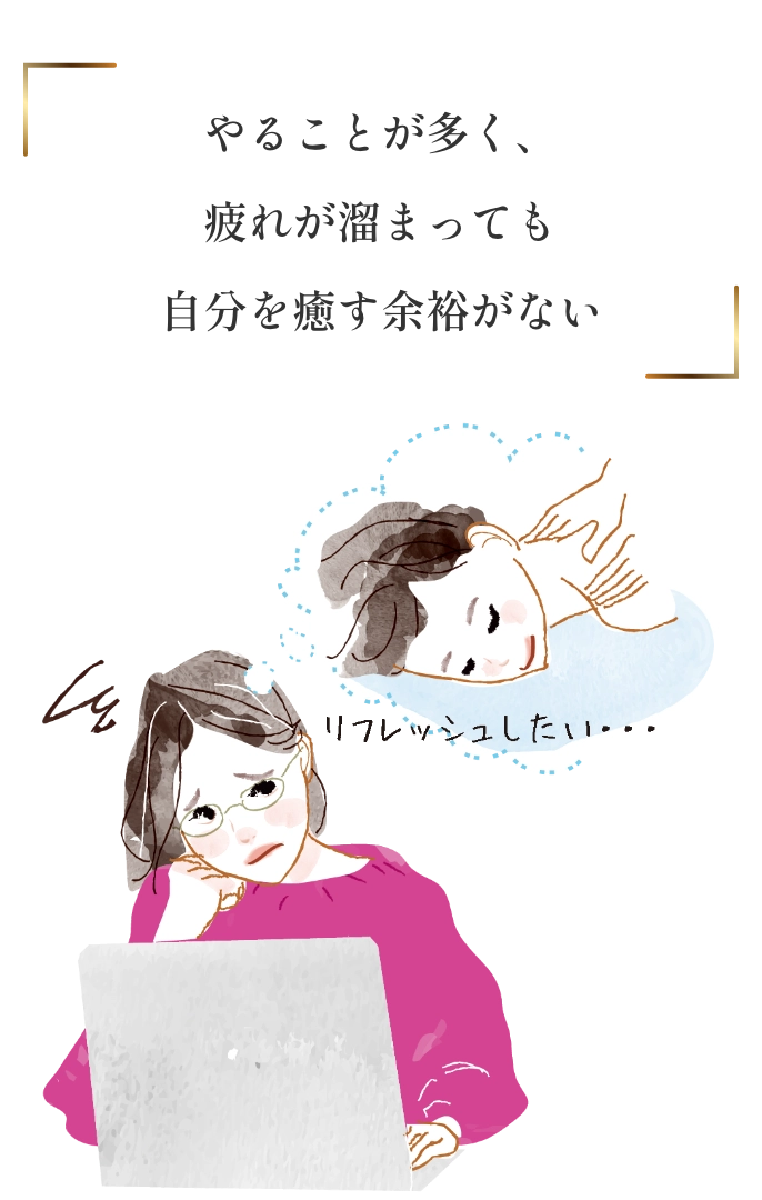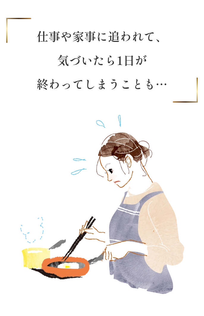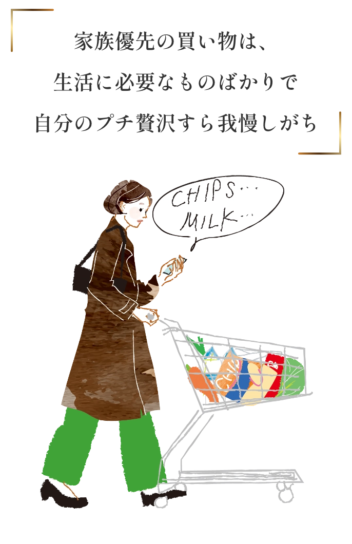 家族優先の買い物は生活に必要なものばかりで自分のプチ贅沢すら我慢しがち。 仕事や家事に追われて、気づいたら1日が終わってしまうことも…。 やることが多く、疲れが溜まっても自分を癒す余裕がない。