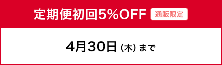 - ・定期便初回5%OFFは、こちらのページの対象商品の定期便にご登録がないお客様(過去に登録があったお客様も含む)が対象となります。現在ご登録のある方は対象外となります。また、お一人様各1点1回限りとなりますので、ご了承ください。
