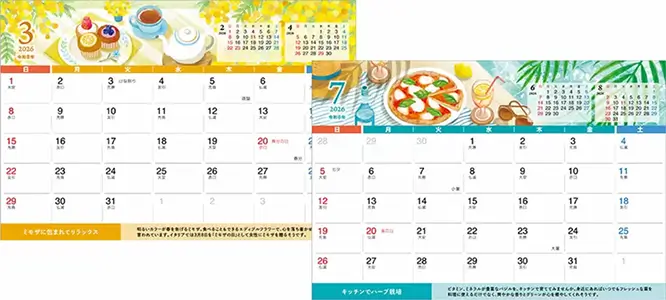 暮らしと食事の豊かなシーンをあたたかみのあるイラストで描いたカレンダー。