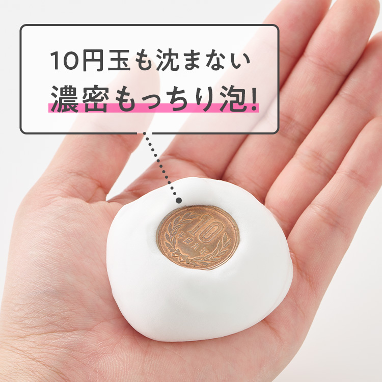 サッと水に溶けるパウダータイプで、泡立てネットを使えば濃密もっちり泡が簡単に完成! 10円玉を乗せても沈まないほどコシのある泡でこすらず洗えるから、摩擦レスで肌にストレスを与えません。
