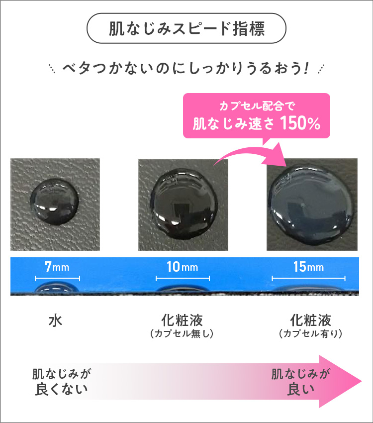上の画像は同じ量の液体を合成皮革の上に垂らして肌なじみスピードを実験したもの。水は肌になじまず広がらないですが、ファンケル独自のカプセルを配合している「トイロ バランシングドロップ」は、肌になじみやすいため大きく広がっています。このカプセルにより、スピーディーに肌に浸透するので、忙しいときのお手入れにもおすすめ!