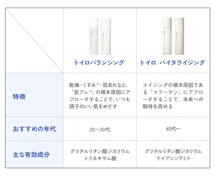 トイロの各アイテムには、肌あれ予防、シワ改善、美白、弾力アップなど、果的な有効成分が配合されています。今の肌状態にぴったりの化粧液と乳液を組み合わせて使ってみましょう!