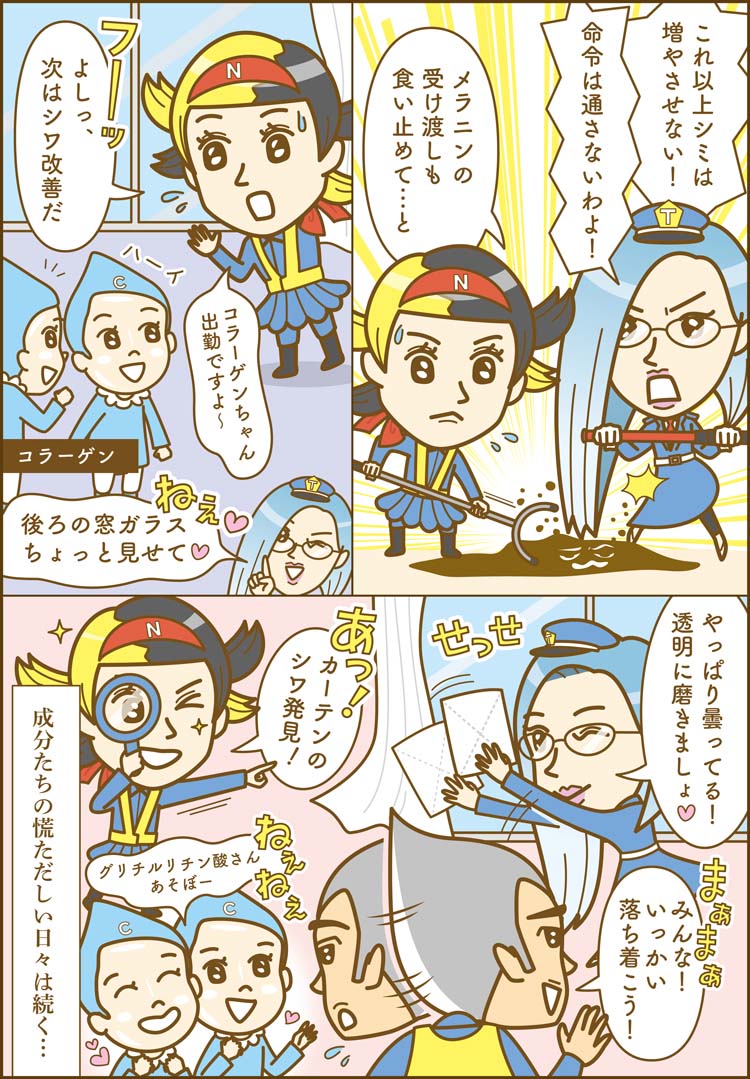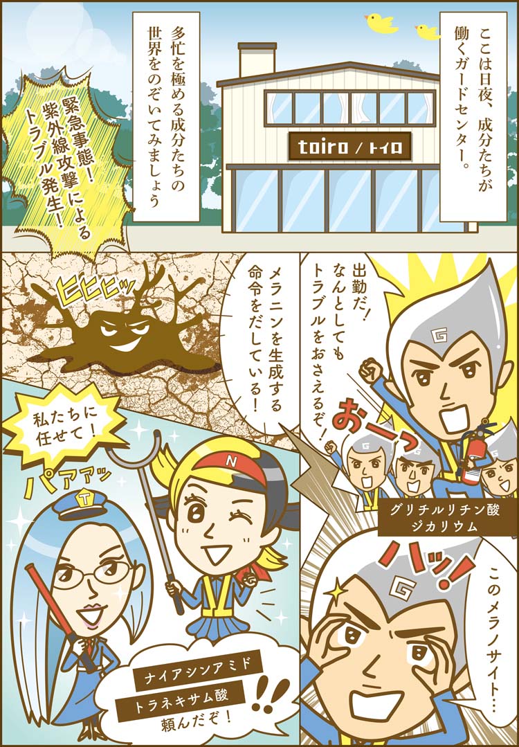 そこで今回は、トイロシリーズを支える3つの有効成分をご紹介。まずは、それぞれがどんな働きをしているのか漫画を通してのぞいてみましょう!