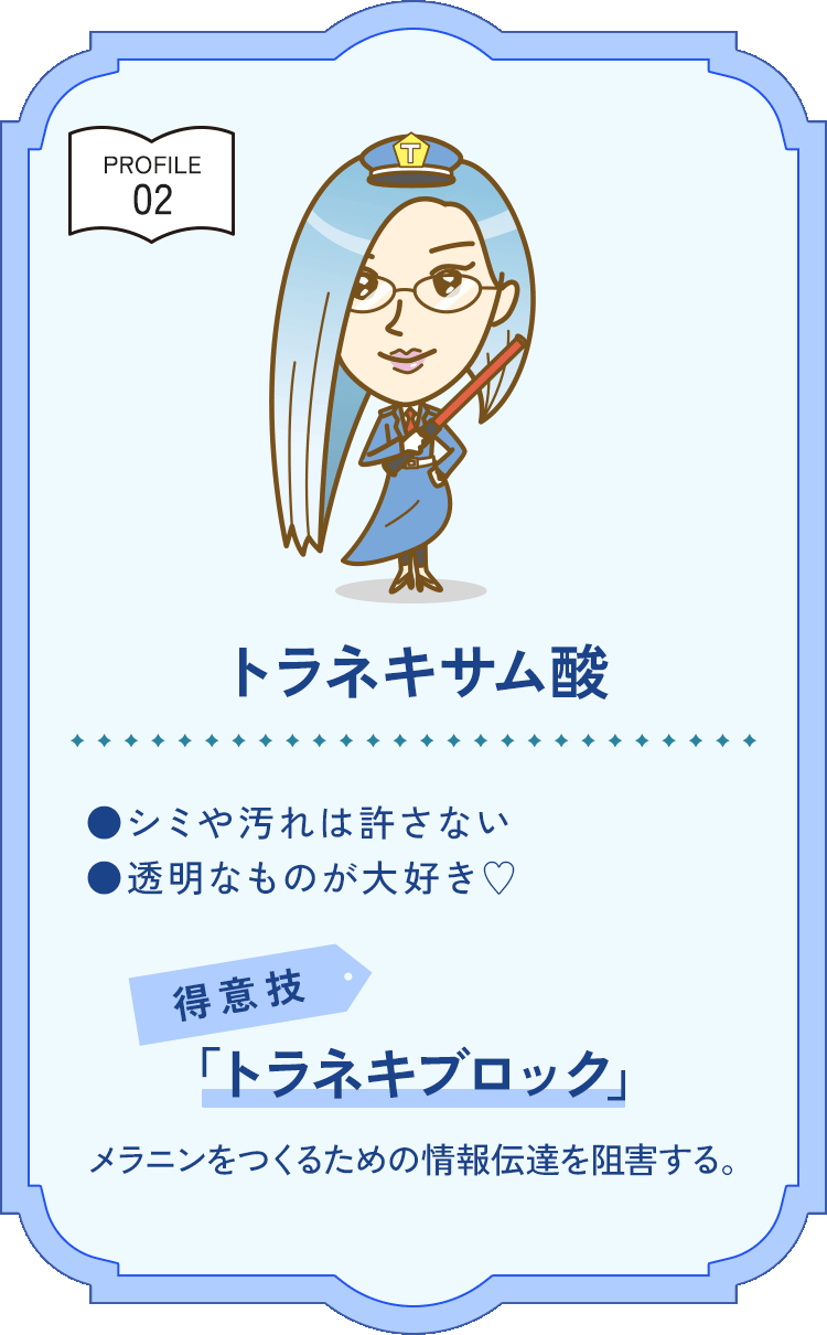 メラニンの生成の初期段階から働きかけて、シミ・そばかすを防ぐ美白有効成分。メラノサイトの活性化因子の一つと考えられているプラスミンの働きを阻害し、メラニンをつくるための情報伝達をブロックします。