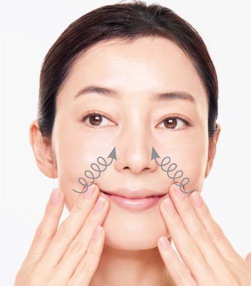 左右の口角に中指を置き、ほうれい線に沿って下から上方向に4回らせんを描き、小鼻の横のくぼみを指先で軽く押しながら引き上げ。2回繰り返す。