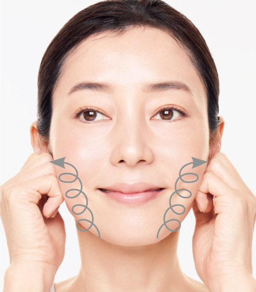 両手でこぶしをつくり、あごに。フェイスラインに沿って、第1関節で4回らせんを描きつつ耳の方向に引き上げ、耳の下で3秒キープ。2〜5回繰り返す。