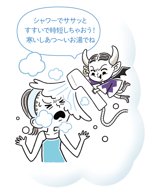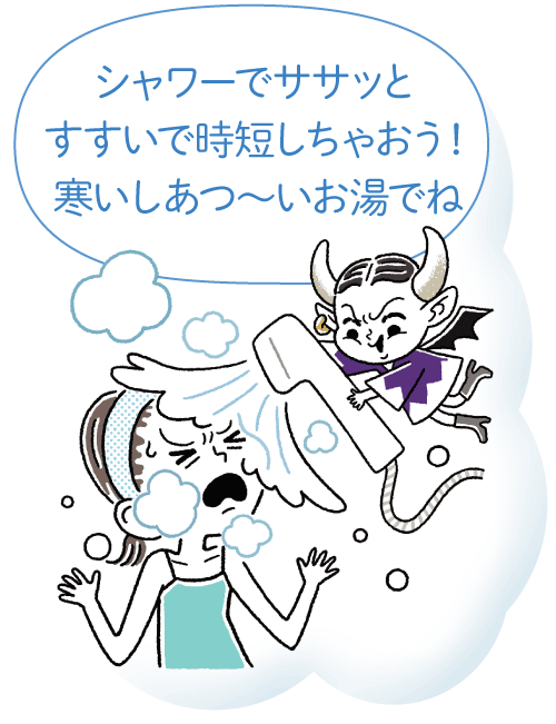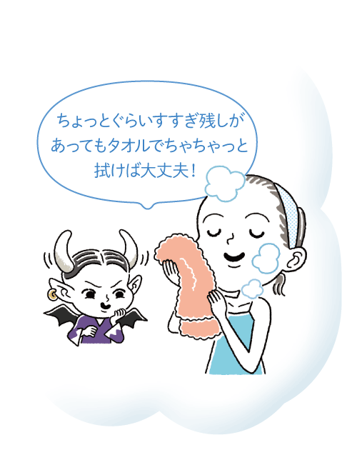 温度の高いお湯は肌のうるおいを奪うのでNG。水圧の高いシャワーを顔に掛けるのも避けましょう。ぬるま湯を手ですくいながら掛けて流して。