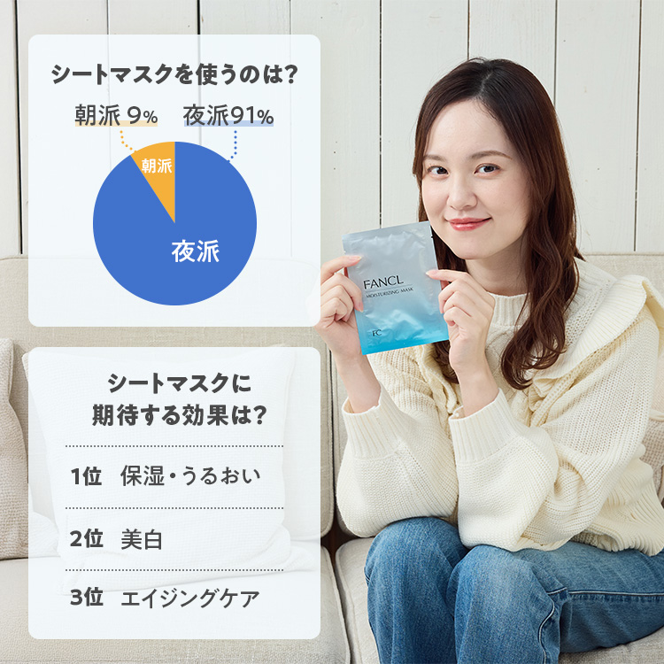 みなさんはどんなときに、どんな目的でシートマスクを使いますか? ファンケル社員を対象にアンケートを実施したところ、シートマスクを使うのは、朝よりも夜が多数派。94%の方が、「保湿・うるおい効果」を期待していることがわかりました。「大事な予定の前日」や「肌の乾燥が気になるとき」に使うという声も多く、集中ケアするなら、シートマスクを投入するのがよいようです!