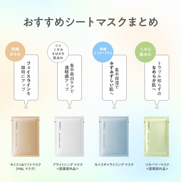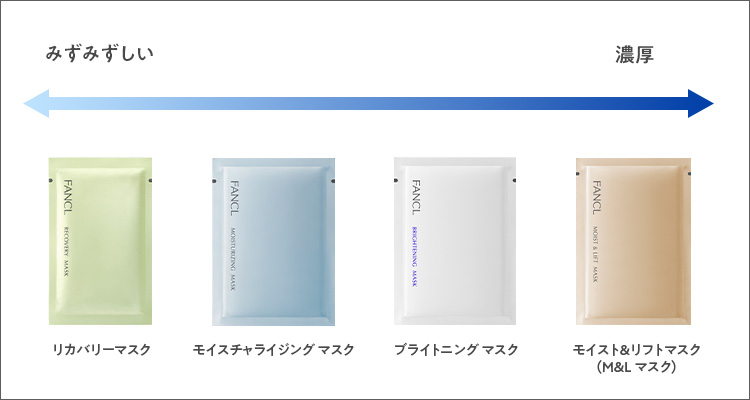 | 商品名 | モイスト&リフトマスク(M&L マスク) | ブライトニング マスク<医薬部外品> | モイスチャライジング マスク | リカバリーマスク<医薬部外品> |