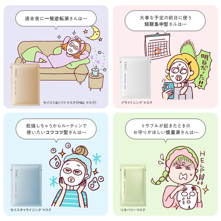 ながらケアや集中ケアに人気のシートマスク、どうやって選んでいますか? ファンケルのシートマスクは4種類。使用感はもちろん、形状も配合成分も価格もそれぞれ異なります。あなたにぴったりのシートマスクの選び方をご紹介します!