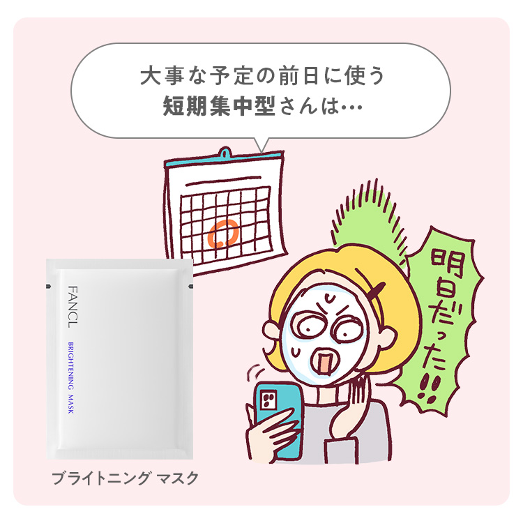 推しのライブやデートなど、大事な予定の前日。鏡に映る自分の顔を見て「どうにかしないと!」と集中ケアしたくなる方には、「ブライトニング マスク」がおすすめ。速攻集中アプローチで、うるおいに満ちた透明感あふれる肌に導きます。