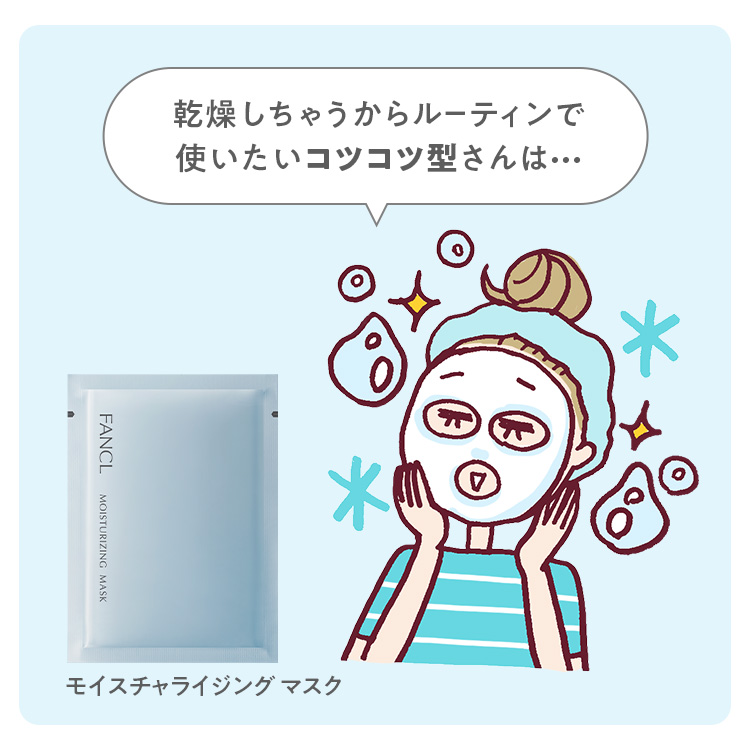 「乾燥しやすいから、定期ケアで肌トラブルを事前に防ぎたい」 という几帳面さんにおすすめなのが、「モイスチャライジングマスク」。うるおいサイクルを整え、肌の保水機能を呼び覚まします。