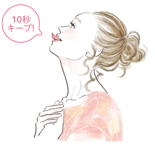 顔を上げ、斜め上方向を見る姿勢で、舌を口の外へ突き出し、上方向に伸ばして10秒キープ。これを2〜3セット繰り返す。