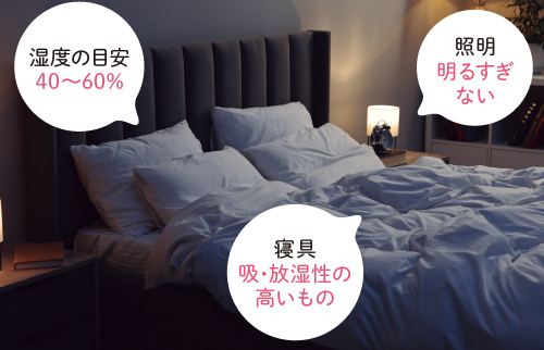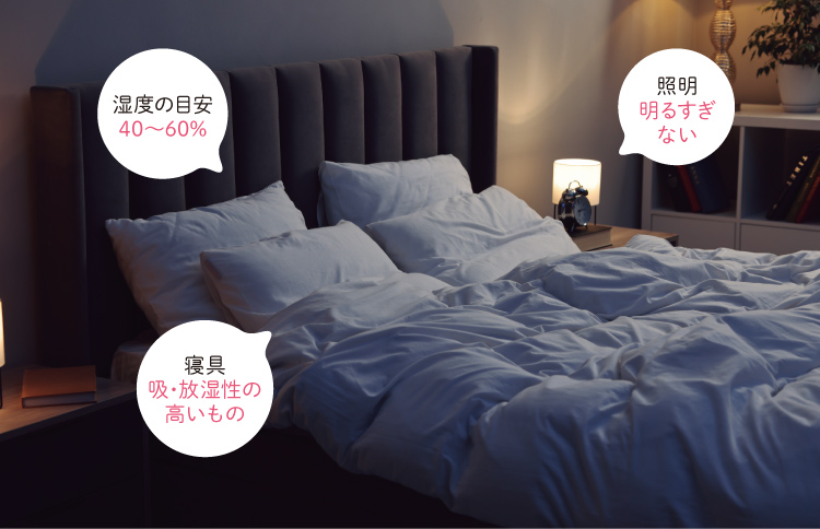 美肌に導く良質な睡眠を得たいなら、寝室の環境を点検。まずこれからの季節、気をつけたいのが湿度。高すぎると汗の蒸発がうまくいかず、熟睡できないので40〜60%を保って。また体温調整や寝返りを妨げず、吸・放湿性の高い寝具を選ぶのも大切。照明は明るすぎないよう調節し、就寝時は消しましょう。