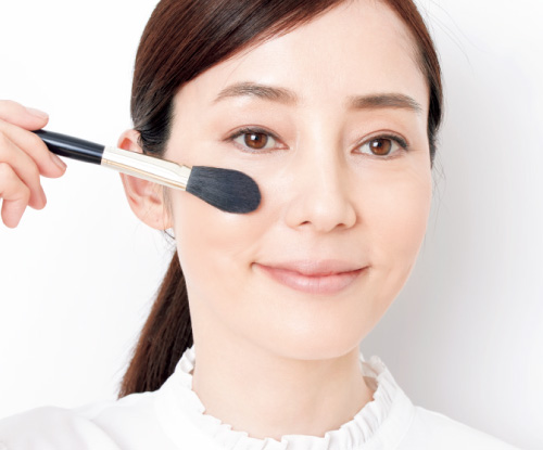 リアルな頬よりも高い部分を起点に血色をのせ、顔の重心を上に置くのがポイント。斜め上に向かってぼかします。