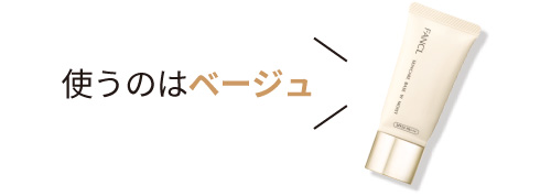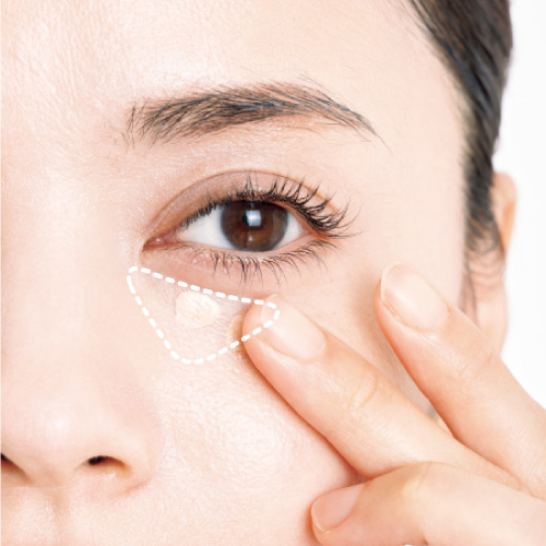 顔全体にベージュの下地を塗ってから、クマがある三角ゾーンに少量を重ねてカバー。クマが目立つ目頭部分に少量をおき、薬指でトントンと軽く叩き込みながら、目尻方向に広げます。