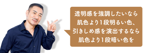 色を選ぶときは、カラースケールを肌に当てて、自分の肌色を見極めよう。最も肌に近い色を使うのが基本だけど、1段明るい色を使って透明感を際立たせたり、1段暗い色で引きしめて見せるのもアリ。