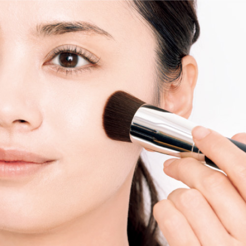 ファンデーションブラシを使ってみて。ファンデーション1プッシュをブラシにとり、手の甲でブラシ全体になじませてから、基本と同様の順で塗ります。ムラなく、より素肌感のあるきれいな肌に。