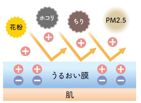 うるおい膜をつくることで肌表面の電位が−から+に変わり、+を帯びている花粉や大気汚染、ホコリなどの外的刺激と反発するハイテクフィルターです。
