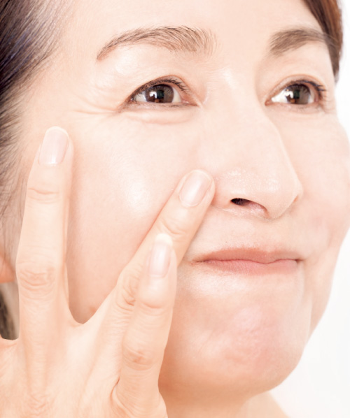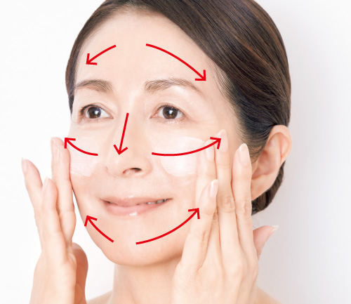 肌が張った状態で薬指を中から外にすべらせるとキレイに塗れ、ほうれい線も目立ちにくく。