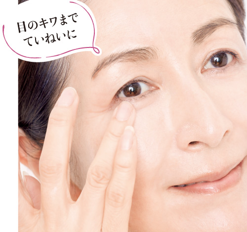 目のキワまでていねいにのばし、きちんと密着させます。目もとは肌が繊細な部分なので、力の入りにくい薬指を使って。