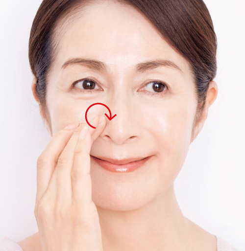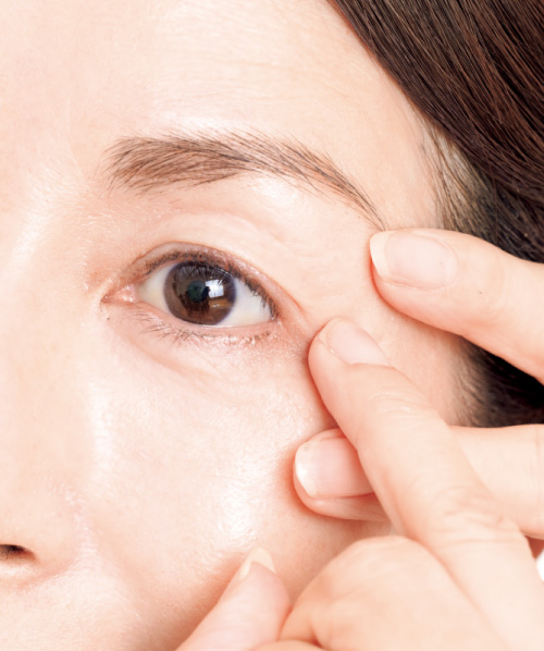 指をチョキの形にして目尻のシワを開き、反対の手の薬指で溝の間にトントン塗り。