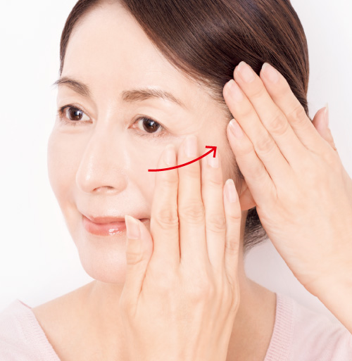 肌を手で引き上げぴんと張った状態にすると、キメの溝や凹凸が平らになって、ムラなく塗ることができます。