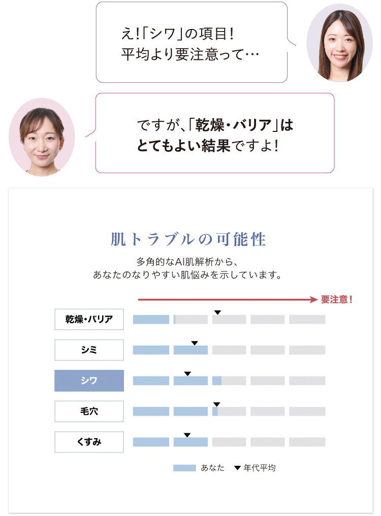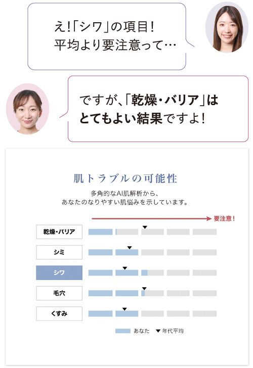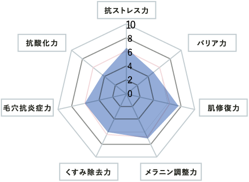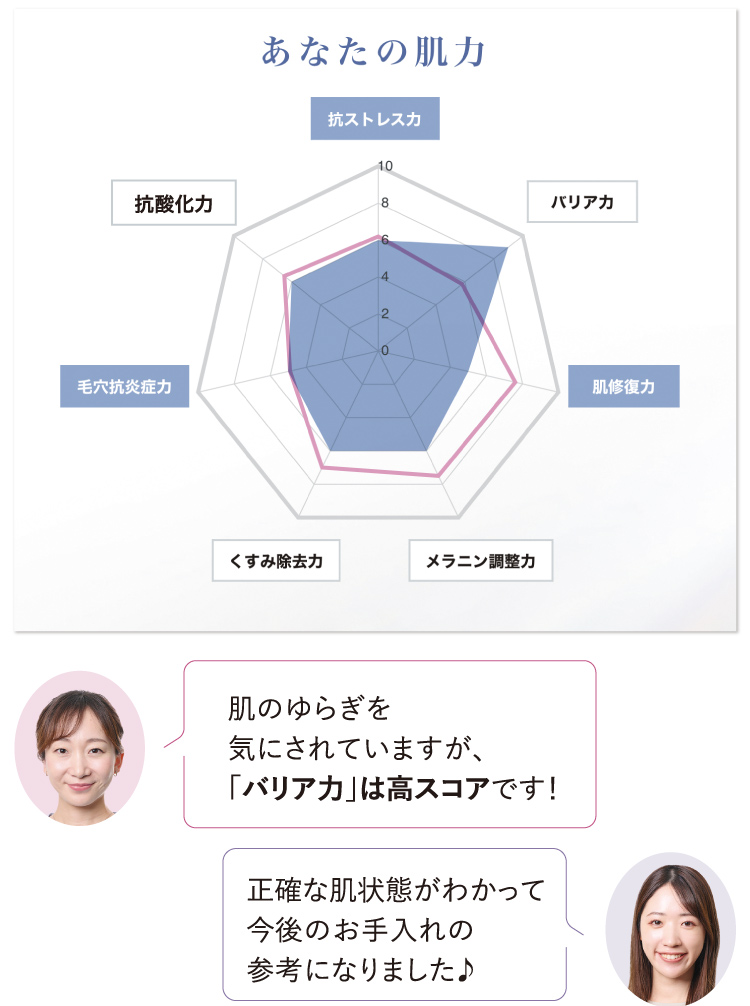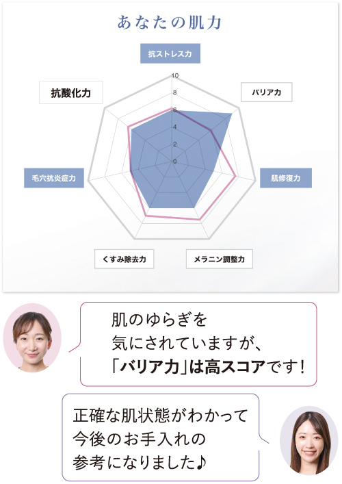 7つの肌力をレーダーチャートでバランス表示。将来の肌トラブルの可能性を予測。