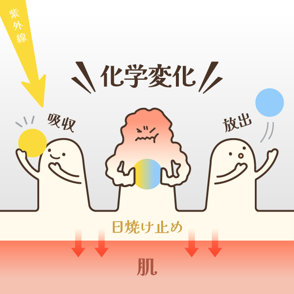 紫外線吸収剤(ケミカルフィルター)は、紫外線を一旦吸収し、そのエネルギーを熱や赤外線など別のエネルギーに変換して放出することで、紫外線が肌に浸透するのを防ぎます。メトキシケイヒ酸エチルヘキシル(オクチノキサート)、t-ブチルメトキシジベンゾイルメタン(アボベンゾン)、オキシベンゾンなどが、代表的な紫外線吸収剤の成分です。