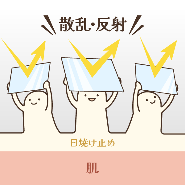 紫外線散乱剤(フィジカルフィルター、ノンケミカル)は、肌の表面に微粒子の膜をつくり、当たった紫外線を物理的に反射・散乱させることで、紫外線が肌に到達するのを防ぎます。酸化亜鉛(Zinc Oxide)、酸化チタン(Titanium Dioxide)などが代表的な紫外線散乱剤の成分です。