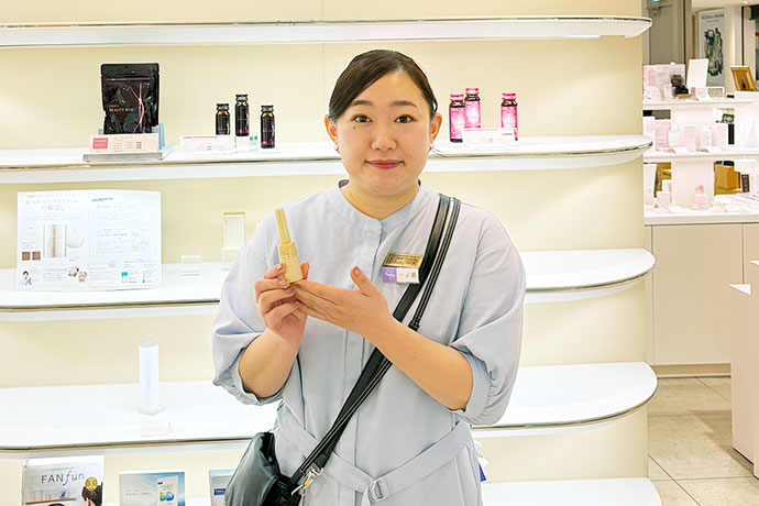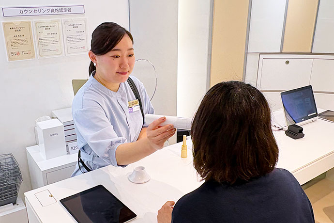 商品を売る前に、まず話を聞く、というスタンスでお客様からお悩みや生活スタイルを引き出せるようにしています。お話を聞きながら肌チェックなどお客様に合ったものを提案するようにしています。
