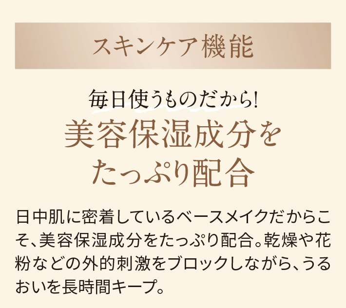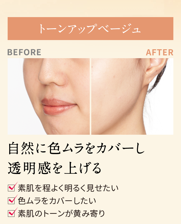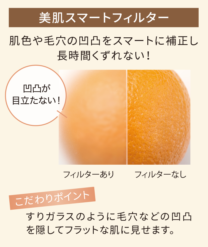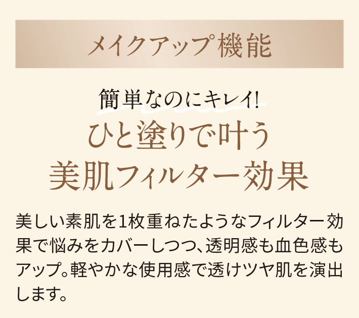 肌色や毛穴の凹凸を補正する美肌スマートフィルター技術とトーンアップ効果で、素肌感のある透けツヤ肌に仕上げながら、うるおいキメ補正まで叶えるCCクリームです。
