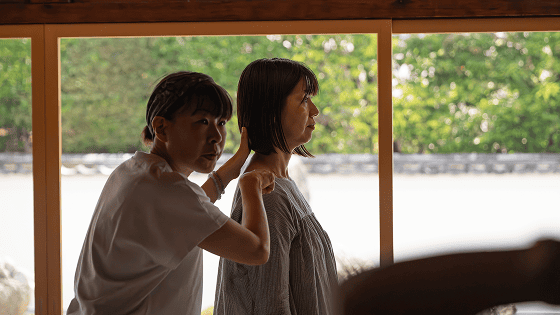 そして呼吸法は口をストローを吸う時のように尖らせる「ストロー呼吸法」。この後のプログラムはこの呼吸法を意識して行いました。最後はマインドフルネス。お庭を眺めながら、呼吸を整えていきます。お寺の神聖な雰囲気も味わいながら、体を整えることで心も落ち着く、ゆったりとした時間になりました。