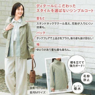 花粉対策に優れ、軽くて丈夫な高機能素材。手洗いOKでいつでも洗えてデイリーに着られる。カジュアルでも、オケージョンにも、シンプルだからこそ使いやすい万能デザイン。