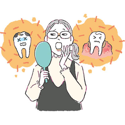 ドライマウスになると、抗菌作用が下がって口の中の雑菌が増えやすくなり、虫歯や歯周病になりやすくなります。そのまま放置せず、歯科医院で適切な治療を受けましょう。
