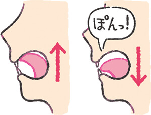 舌の筋力を鍛えるトレーニングです。舌を上あごにのせた後、「ぽんっ!」と音が鳴るように舌をはじいて動かします。1日5~10回を目安に行いましょう。