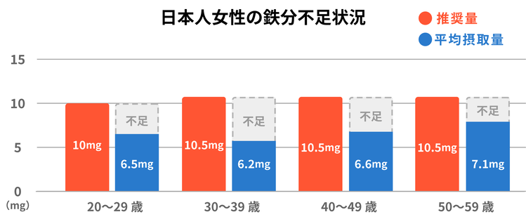 一方で女性は平均摂取量が6.5〜7.1mgと推奨量を下回っており、特に20〜40代では3割以上不足していることがわかります。そのため女性は、日頃から意識して鉄分を取り入れることが大切です。