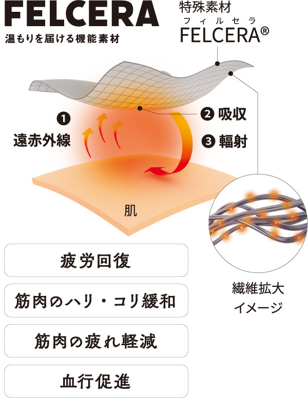 体から放出される遠赤外線の熱をセラミックスが吸収して体へ輻射(ふくしゃ)。