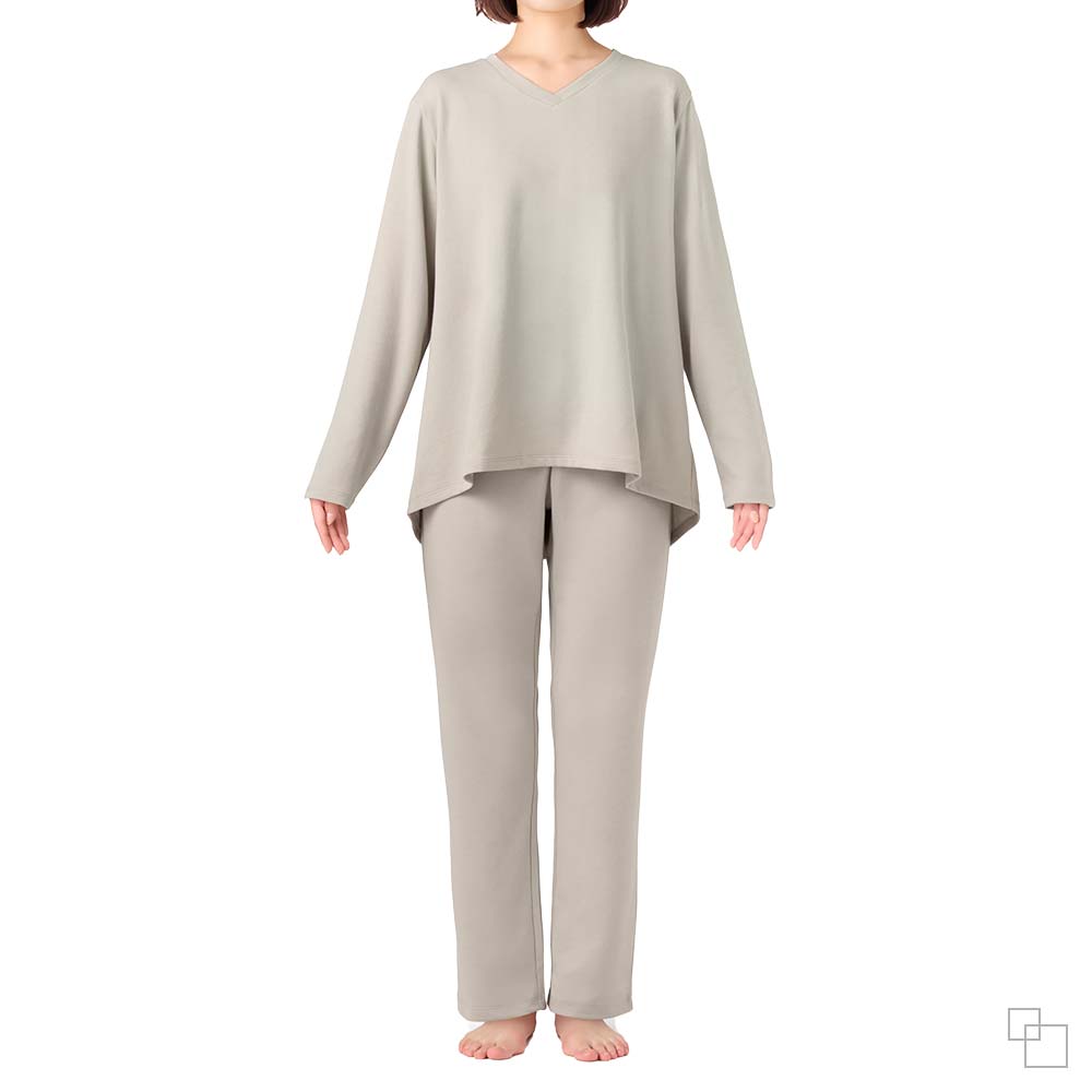 長め丈トップスとおへそまで包むパンツが冷えを防ぐ