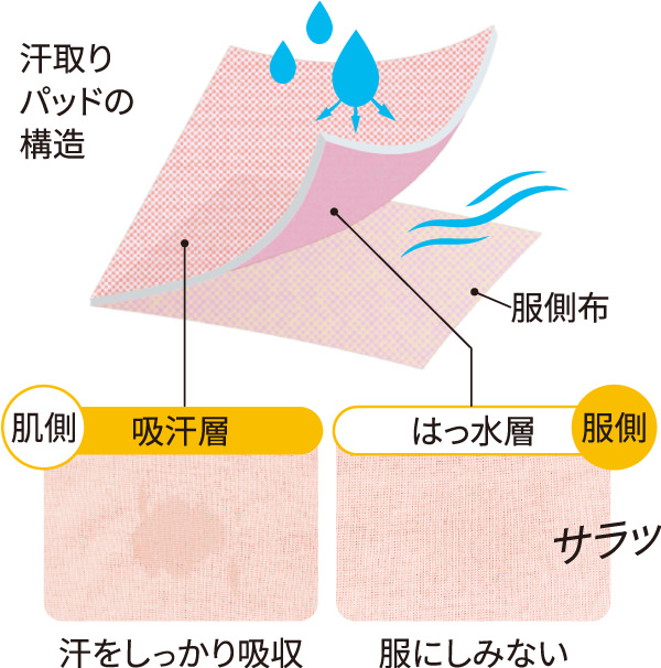 肌側で汗を吸いとり、服側ははっ水加工で汗が服ににじみ出にくい構造