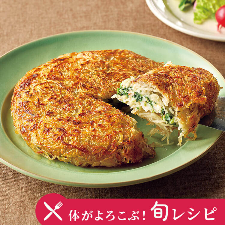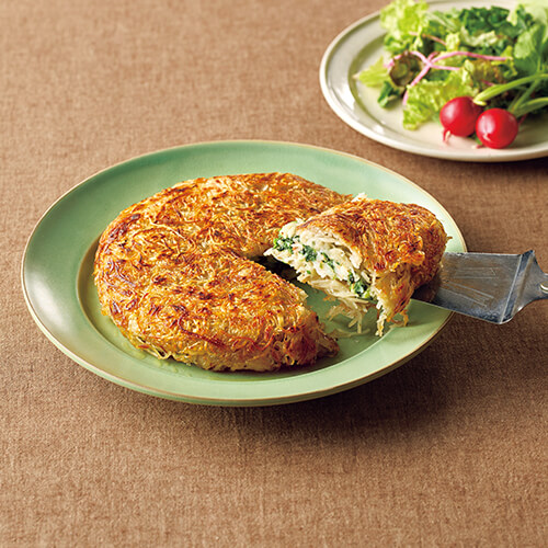 ほうれん草は下記の「ゆで方」の要領でゆでるか、ラップで包みレンジ(600W)で1分半加熱し、みじん切りにして水けを絞る。じゃがいもは皮付きのままスライサーか包丁で細いせん切りにし、塩を加えて軽くもむ。水分が出るので、全体をぎゅっと絞ってしっかり水けをきる。