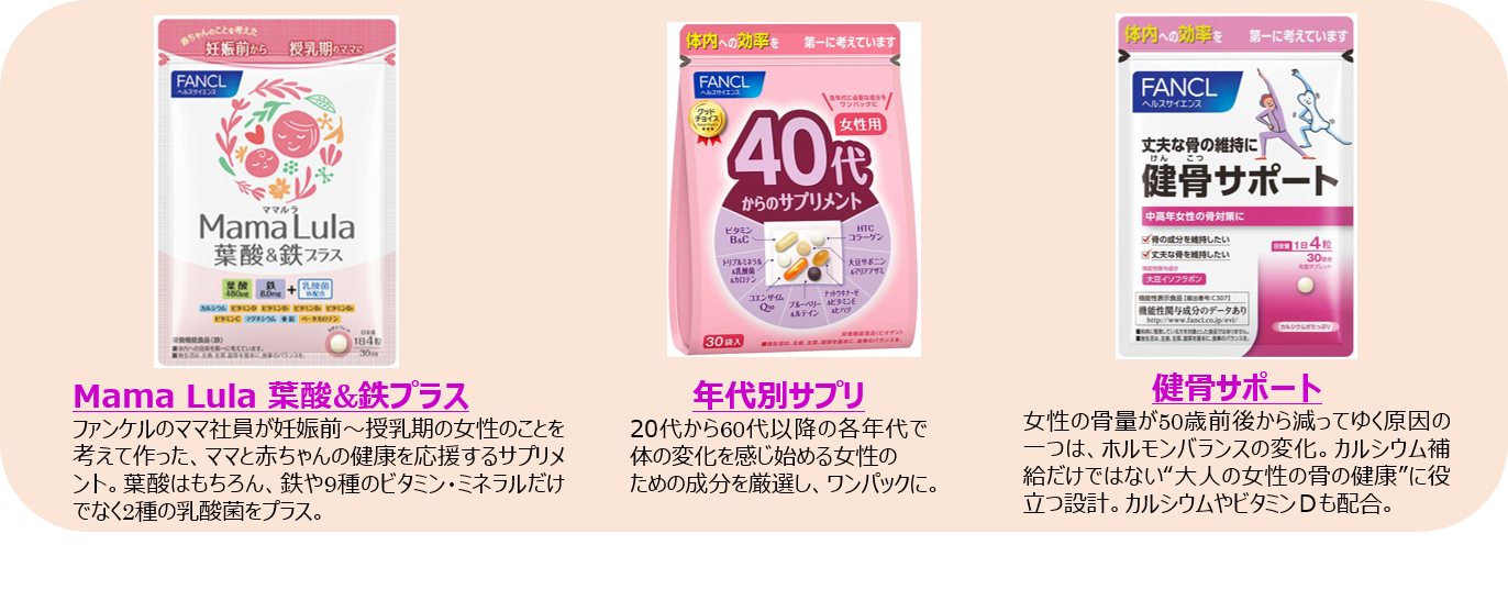 女性は、年代に応じて、ホルモンバランスや体調が大きく変化していきます。ファンケルはお客様の80%以上が女性ということもあり、個々の女性の健康悩みに耳を傾け、製品の開発に反映しています。