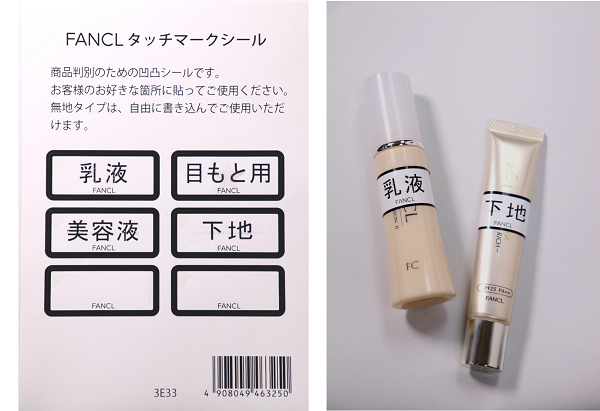 「タッチマークシール」は、視覚に障がいがある従業員や視覚障がい団体からの意見を参考にし、凹凸を付けたファンケル独自のシールです。