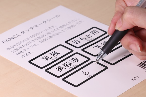 視覚障がいの方は、成人になってから中途で視力を失うことが多く、「点字」を学んでいない方が多いと言われています。そこでファンケルは、1998年に、化粧品の容器が区別しにくいなどの不便を感じている方に、触れるだけで製品を識別できる「タッチマークシール」を開発しました。