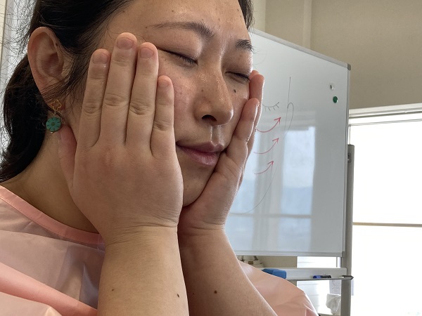 まずは、顔の筋肉を手で触りながら、確認。その後、化粧液、乳液を優しく塗布していきます。