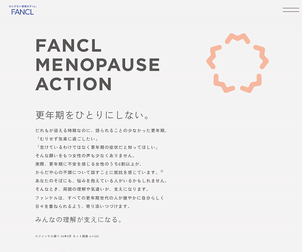 昨年の世界メノポーズデー(2024年10月18日)からスタートした「ファンケル メノポーズアクション」では、「更年期をひとりにしない。みんなの理解が支えになる。」というメッセージのもと、更年期時期を過ごす女性が心身ともに健やかに過ごせる環境づくりを目指す活動を行なっています。