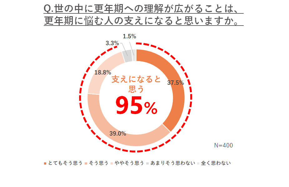 2024年に実施した更年期に関する意識調査※1では、「世の中に更年期への理解が広がることは、更年期に悩む人の支えになると思いますか」と聞いたところ、95%と多くの方が「理解が広がることで支えになる」と回答しました。家族や周囲の人が更年期について理解して相談できる環境を整えることが、更年期で悩む人を支えることにつながると考えられます。