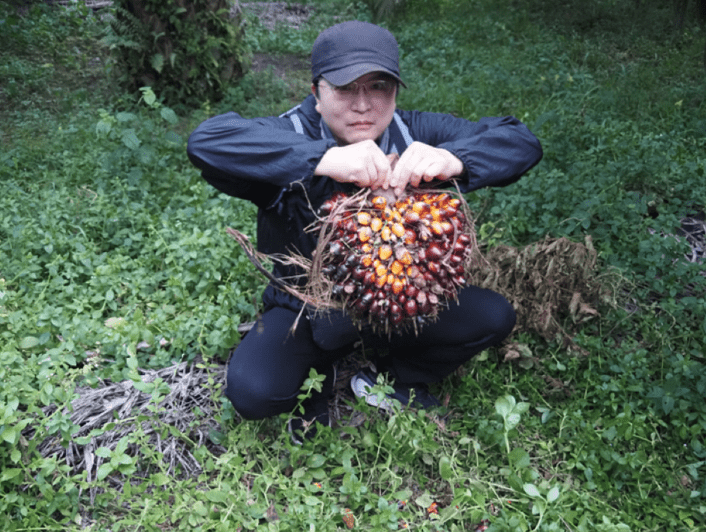 パーム果実の収穫時期が過ぎていたため、収穫を見ることができませんでしたが、農園内のパーム果実を見せていただきました。私が掲げている上記のパームの実は、上半身の一部が隠れるほど大きかったですが、実際に収穫する実と比較すると、一回り小さい実であると知り、その大きさに驚きました。