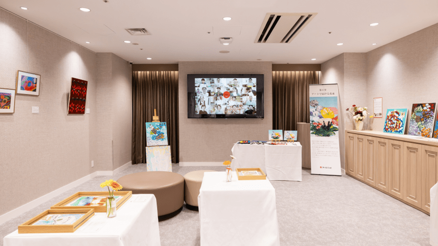 アートのレンタル事業によって、癒しや柔軟な思考の魅力を提案し、地域社会とアーティストをつなげているアトリエにっと様。"アートで皆さまを笑顔に。障がいの有無に関わらず、誰もが心温まるクリスマスになりますように"という願いを込め、クリスマスプレゼントを受け取ったときのワクワクと喜びを感じられるような作品を展示いただきました。