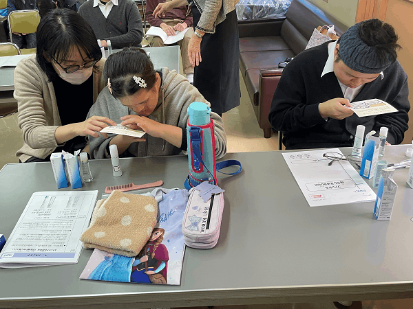2006年からは、特別支援学校や盲学校の高校生を対象に、卒業後に自信をもって社会人の一歩を踏み出す支援がしたいという想いで、身だしなみセミナーを実施しています。洗顔・スキンケア・日焼け止め・整髪の実習、においのケアや健康についての講義を行ない、自身で「基本の身だしなみ」を整えられるようにする実践型のセミナーです。